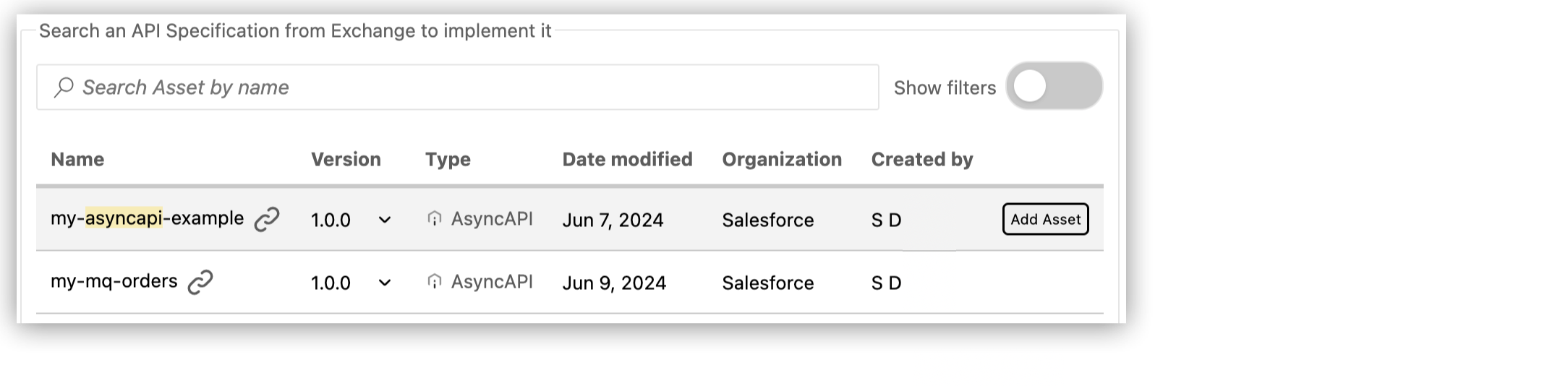 Only supported versions of the AsyncAPI specifications in Exchange are available for scaffolding. Unsupported versions don’t appear in the search results.